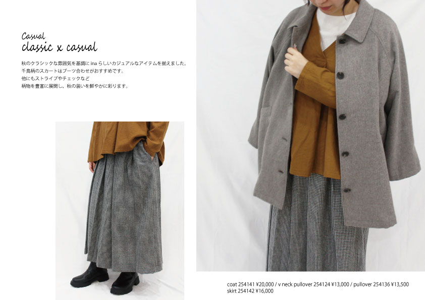 秋のクラシックな雰囲気を基調に、inaらしいカジュアルなアイテムを揃えました。