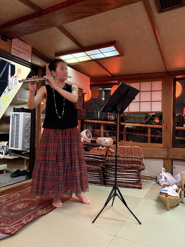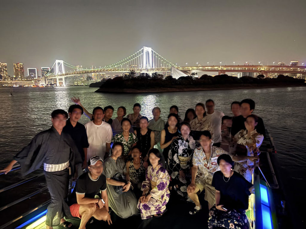 屋形船にゆられて、品川から東京湾、隅田川をまわるコースで、新鮮な刺身や揚げたて天ぷら等の豪華料理、フジテレビやレインボーブリッジ、東京スカイツリー...東京湾のきらびやかな夜景、フルートの生演奏やゲーム等、みんなで楽しみました。